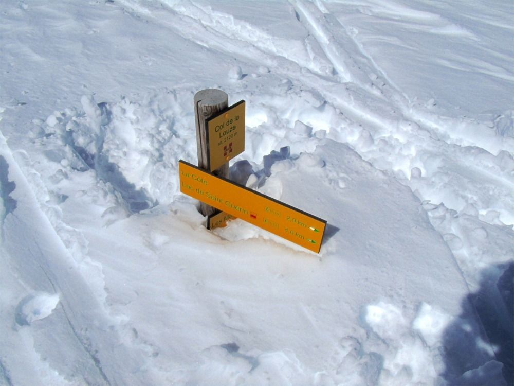 On arrive au col de la Louze (2119) où le cairn est entièrement sous la neige et dont le panneau affleure juste.